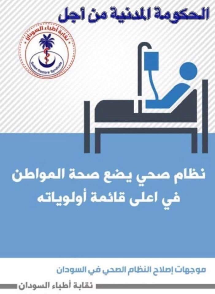 وقال البيان ان من ضمن هذه المطالب التي نادى بها الشعب ” برنامج السياسات الصحية البديلة المتكامل الذي تم التوافق عليه من قبل أجسام الثورة الصحية أثناء ثورة ديسمبر وتبناه الثوار يشكل اساسا لإستعدال هذه الخدمة الهامة مما يعيد للقطاع الصحي الحكومي العلاجي والوقائي مكانته الأولى ويقدم الخدمة للمواطن السوداني ويحافظ علي صحته…”
