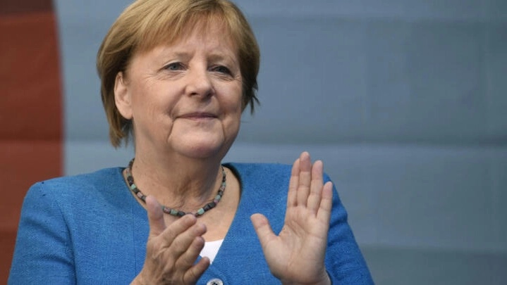 المستشارة الألمانية أنغيلا ميركل تصفق خلال تجمع انتخابي لزعيم حزب الاتحاد الديمقراطي المسيحي ومرشح المستشار أرمين لاشيت (ليس في الصورة) في آخن، غرب ألمانيا، في 25 سبتمبر/ أيلول 2021 © أ ف ب