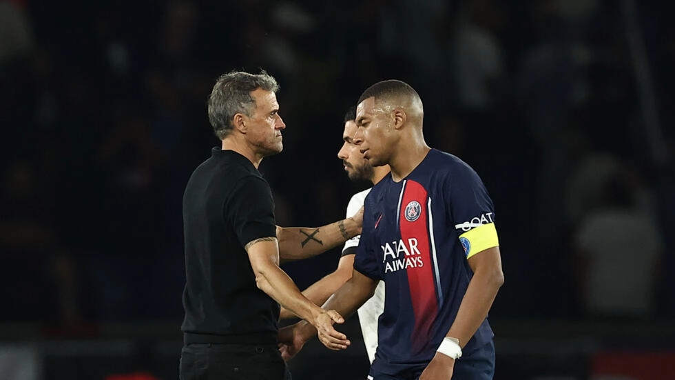 المدرب الإسباني لويس إنريكي مع المهاجم كيليان مبابي عقب خسارة باريس سان جرمان أمام ضيفه نيس في افتتاح المرحلة السادسة من الدوري الفرنسي لكرة القدم في 16 أيلول/سبتمبر 2023 © فرانك فيفي / ا ف ب/AFPوسجل ثلاثية نيس، النيجيري تيريم موفي (21 و68) وغايتان لابورد (53)، فيما أحرز مبابي ثنائية نادي العاصمة (29 و87).