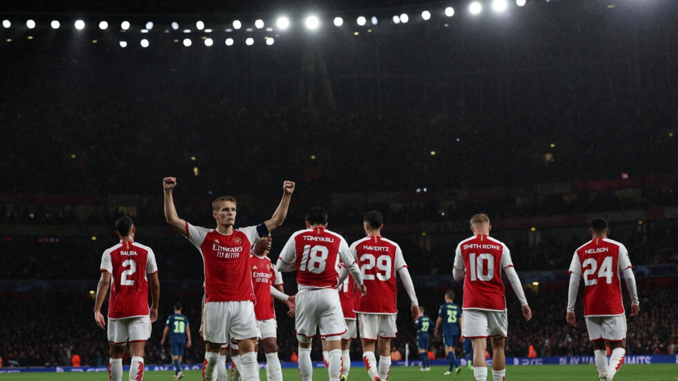لاعب خط وسط أرسنال النرويجي مارتن أوديغارد يحتفل بتسجيل الهدف الرابع للفريق خلال مباراة كرة القدم بالمجموعة الثانية لدوري أبطال أوروبا مع أيندهوفن على ملعب أرسنال شمال لندن في 20 أيلول/سبتمبر 2023. © أ ف بحقق أرسنال الإنكليزي عودة قوية إلى مسابقة دوري أبطال أوروبا، بفوزه الكبير على ضيفه أيندهوفن الهولندي 4-0، وعانى ريال مدريد الإسباني قبل التغلب على ضيفه أونيون برلين الألماني 1-0، فيما حقق بايرن ميونيخ الألماني فوزا مثيرا على ضيفه مانشستر يونايتد الإنكليزي 4-3 الأربعاء في الجولة الأولى من دور المجموعات.
