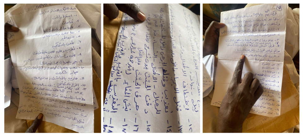 وكتب في إحدى الملاحظات “شاهدت مواقع تواجد الجثث على طول الطريق”. ثم أدرج أسماء خمسة مواقع رأى فيها الجثث أثناء رحلته إلى تشاد.