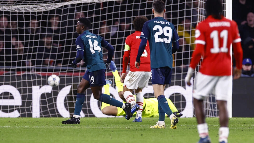 مهاجم أرسنال الإنكليزي إدوارد نكيتياه يسدد ويسجل الهدف الأول في مرمى أيندهوفن الهولندي ضمن الجولة السادسة الأخيرة من دور المجموعات لمسابقة دوري أبطال أوروبا على ملعب فيليبس ستاديوم في أيندهوفن في 12 كانون الأول/ديسمبر 2023 © كينزو تريبويارد / ا ف بوكان أرسنال الذي تخلى عن صدارة الدوري لصالح ليفربول بخسارته أمام أستون فيلا 0-1، ضمن صدارة المجموعة وتأهله إلى ثمن النهائي للمرة الأولى منذ سبعة أعوام.