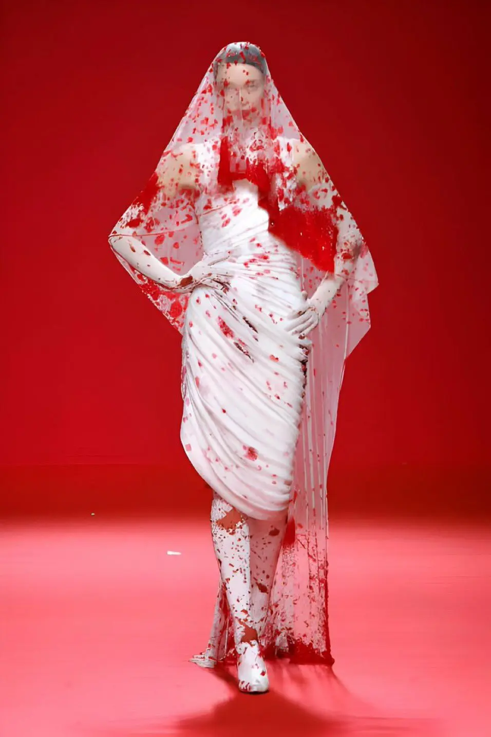 وبنظرة مقربة على المجموعة، نرى ثوب العارضة الملطخ بالدم والطرحة المزينة بشكل معقد بزخارف تشبه الجوهرة الحمراء، وجوارب الزفاف البيضاء الملطخة بالدماء.