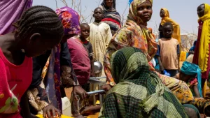 لاجئون سودانيون يتجمعون لملء المياه في مخيم فرشانا