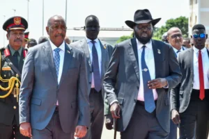 سلفاكير (يمين) استقبل البرهان في جوبا (رويترز)