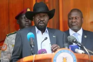 رئيس جنوب السودان سلفاكير ميارديت بجانبه نائبه السابق رياك مشار (يمين) خلال مؤتمر صحفي في جوبا (رويترز)