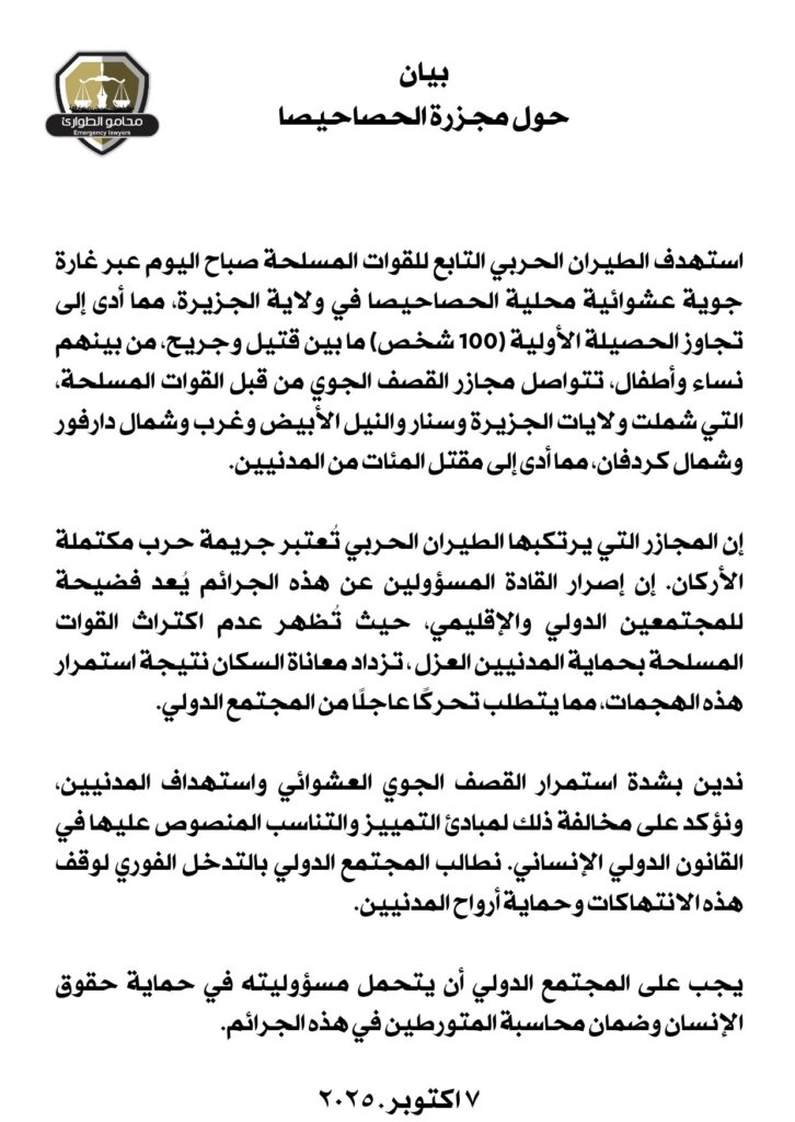 وأدان المحامون بشدة القصف العشوائي للمناطق المدنية، واصفين إياه بـ”جريمة حرب كاملة الأركان”. وأضافوا أن “إصرار القادة المسؤولين على ارتكاب هذه الجرائم يمثل فضيحة للمجتمعين الإقليمي والدولي، ويظهر استهتار القوات المسلحة بأرواح المدنيين العزل”، مطالبين بتدخل المجتمع الدولي.