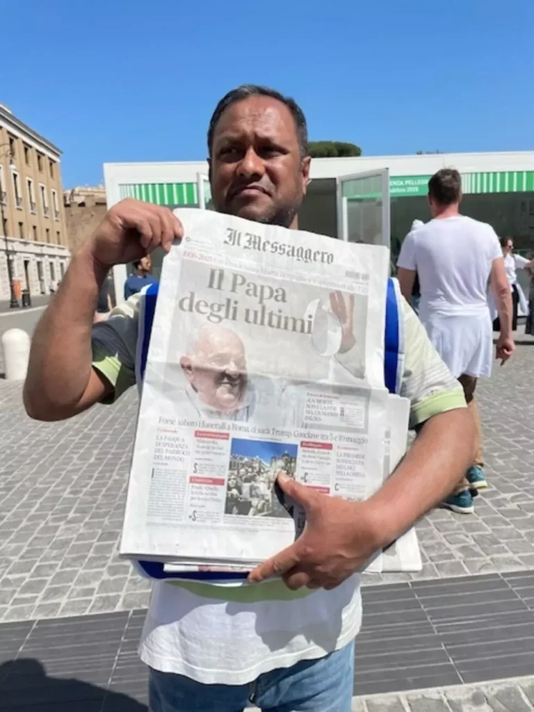 وعند مشارف الفاتيكان، كان بائع صحف بنغالي يتحدث للشرطة التي طالبته بالابتعاد عن المكان، وهو مهاجر في إيطاليا منذ 12 عاما، قبل أن نتوجه إليه بأسئلتنا حول رأيه بشأن مواقف البابا من المهاجرين، إلا أنه تفادى الرد عليها رغم محاولاتنا العديدة، ليقول في خضم الحديث إليه إنه يقيم في هذا البلد الأوروبي لوحده، ويعيل أسرته التي بقيت في بلاده.