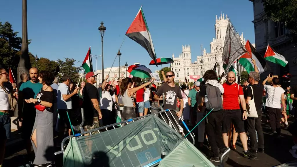 واقتحم متظاهرون يلوحون بالعلم الفلسطيني ويرددون شعارات مؤيدة لغزة، الحواجز في شارع غران فيا الشهير في وسط العاصمة السياحي ودخلوا إلى مسار السباق.