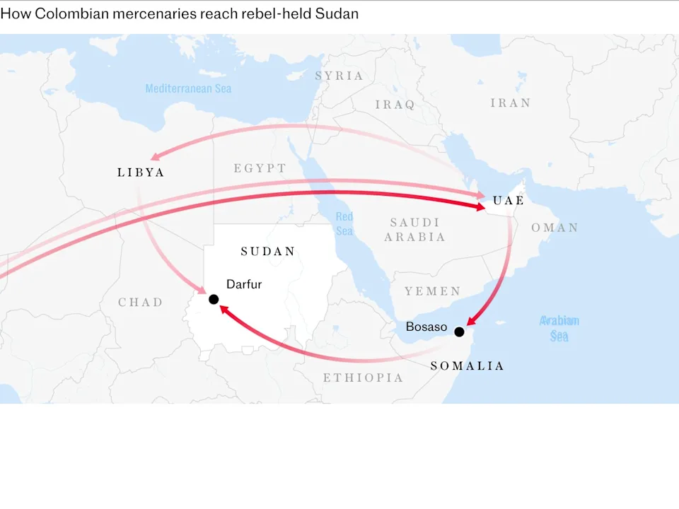 الحكومة السودانية اتهمت شركات أمنية خاصة مقرها الإمارات، على رأسها “مجموعة جلوبال سيكيوريتي سيرفيسز” في أبوظبي، بأنها ضمن شبكة التجنيد. في بوغوتا، تتولى شركات وسماسرة استقطاب جنود كولومبيين متقاعدين. تقارير تشير بأصابع الاتهام إلى ضباط متقاعدين مثل العقيد ألفارو كويخانو وزوجته كلوديا أوليفيروس، لكن كليهما ينكران أي صلة.