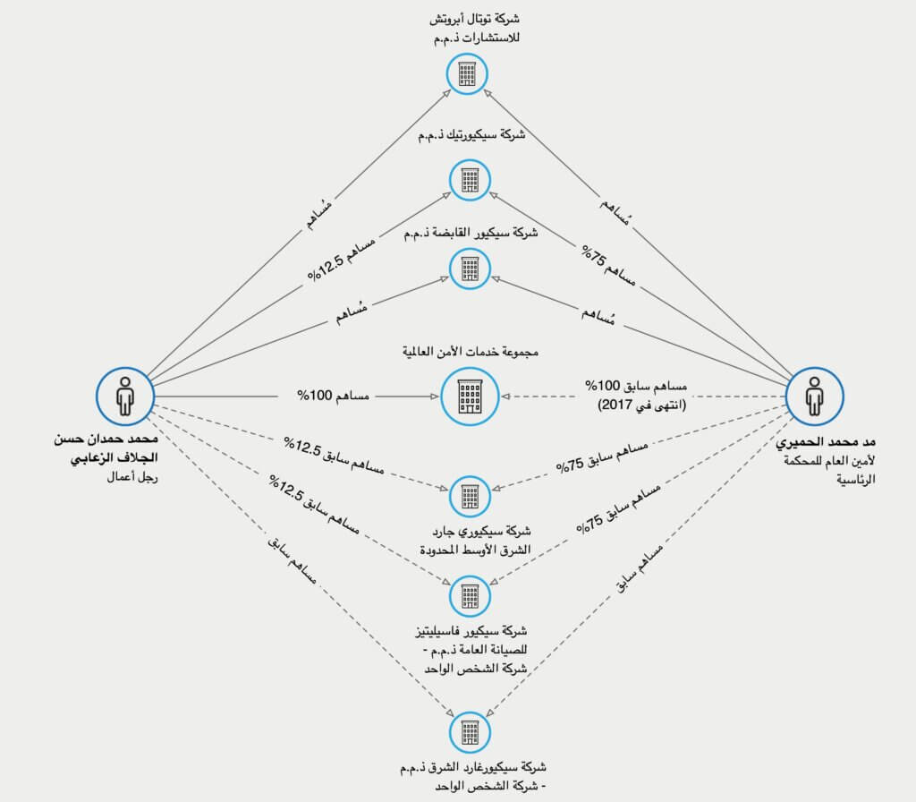 تكشف السجلات التجارية عن علاقات وثيقة بين الزعابي والحميري تمتد لسنوات. إذ يمتلك الحميري 75% من شركة إماراتية لتقنية المعلومات تُدعى “سيكيورتك” (Securetech)، بينما يمتلك الزعابي 12.5%. وحتى عام 2023، كان الاثنان شريكين أيضاً في شركة “سيكيورجارد ميدل إيست” (Securiguard Middle East)، إحدى أكبر شركات الحراسة والأمن في المنطقة.
