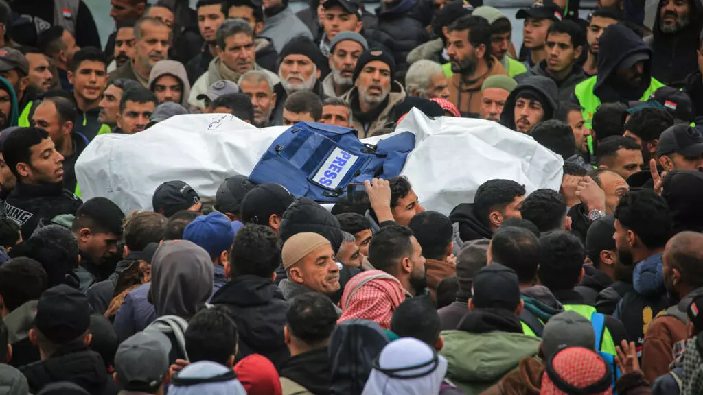 موكب جنازة ثلاثة صحافيين فلسطينيين في خان يونس في جنوب قطاع غزة في 22 كانون الثاني/يناير 2026 غداة مقتلهم في غارة إسرائيلية © بشار طالب / ا ف ب
